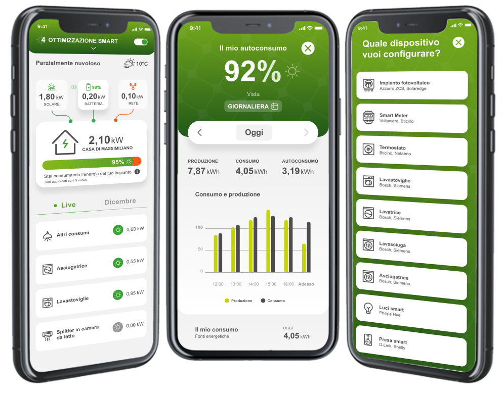 Grazie a questa applicazione all’avanguardia, massimizzi l’efficienza del tuo impianto fotovoltaico. Potrai visualizzare facilmente, tramite grafici intuitivi, i dati relativi all’energia prodotta, prelevata dalla rete o immessa in rete, e al consumo totale della tua casa.
